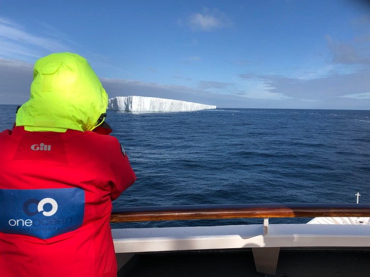 A sizeable cooked breakfast was on offer in the dining room, or you could graze freestyle at the bistro. It was an important slightly private part of the day, as you never knew quite what the later draws on your energy might be, if making a landing. I favoured the airy bistro on the upper deck where you could get outside quickly if you wanted to. People clutched their coffees and spoke in hushed tones, sometimes going out to take photos or to assess the cold. This was also important as it determined how much clothing you might put on. Occasionally there’d be a call from the bridge and everything stopped when there was a whale or bird sighting. There would follow a mad dash to seize cameras and an extra layer to join the ranks of avid photographers outside.